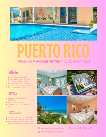 Daily yoga will be offered on the property's gorgeous rooftop terrace or private beach and will include a variety of energy moving and meditation experiences including power, yoga, yin yoga, Yoga Nidra, sound, and workshops. We will visit Old Juan, a cultural hub of the island, and experience the architecture, music, and incredible food there, we will venture to the popular Luquillo beach kiosks one of the island’s most popular beaches with fun shops and authentic Puerto Rican foods, and kayak in one of the island’s rare and exclusive bioluminescent bays.